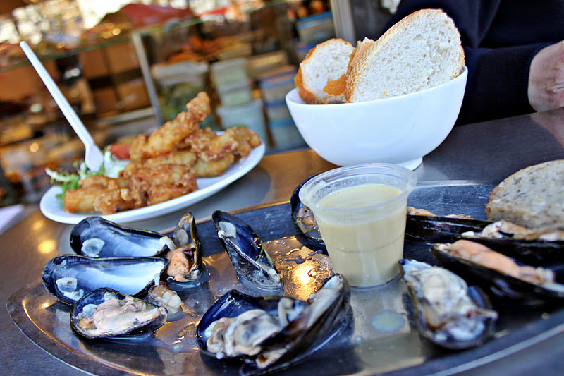 Before catching my 2pm train, the one thing left to try was mussels from Brussels. I read about this great seafood stand that is always packed with locals, and people get little plates and eat it standing up outside at the counter.  The Brussels specialty is “moules frites”, steamed mussels w/ fries, so when I saw “moules parquet,” I assumed it was, what, a packet/parquet of mussels…like maybe I’d get a paper cone of fries piled with mussels. Great.