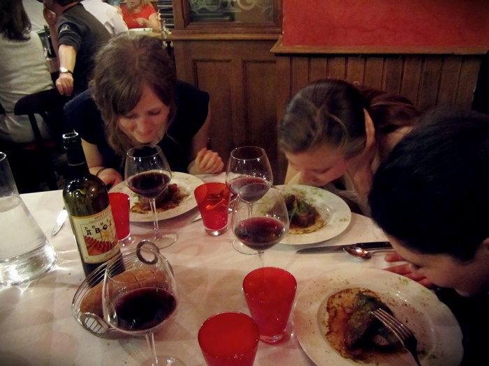 By the way, how precious is that 16-year-old looking waiter?  Well let me tell you, about 10 minutes later, I don’t know what he did wrong but Jego, the chef (my bf), was in a terrible mood, and not only started yelling at this kid across the restaurant but shot out from the kitchen and pushed him straight out the front door. With another waiter in front him, who just got shuffled out in the frenzy as Jego bulldozed them both through the room.  And when the sweet waiter came back in, he was blinking back tears!  Oh, we all just wanted to hug him, poor thing.  Jego was scowling and yelling the whole night, I’ve never seen him in such a mood before.  And obviously, we’re best friends and married, so that says a lot.
