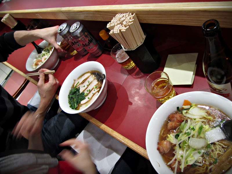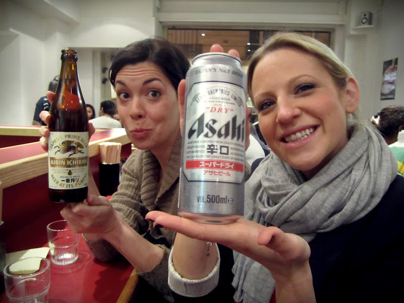 Ooooookay. The Janonese don’t play when it comes to beer. We decided to order Japanese beers, thinking we were getting a normal bottle of beer, and then BOOM, here’s your wine-bottle sized bottle of beer and your 40. This is not an optical illusion. The bottle and beer can were twice the size of our heads.